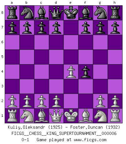 Last move : 0-1 2019 September 2 19:7:40 [Event "FICGS__CHESS__KING_SUPERTOURNAMENT__000006"] [Site "FICGS"] [Date "2019.09.02"] [Round "1"] [White "Kuliy,Oleksandr"] [Black "Foster,Duncan"] [Result "0-1"] [WhiteElo "1925"] [BlackElo "1932"] 1.e4 e5 2.f4 exf4 0-1 King's gambit accepted Player Black won this chess game. Follow this game move after move (download)Bobby just drops the pieces and they fall on the right squares. (Miguel Najdorf) Ich bin Weltmeister und muß mit niemandem irgend etwas diskutieren. (Viswanathan Anand) Un entendimiento a fondo de las continuaciones típicas del mate, hace de las combinaciones de sacrificio mas complicadas conducirlas a ellas no solo sin dificultad, sino casi de una manera natural. (Siegbert Tarrasch) Soyez une menace à chaque fois que vous vous asseyez pour jouer. (Ken Smith) Memory is a crazy woman that hoards colored rags and throws away food. (Austin O'Malley)