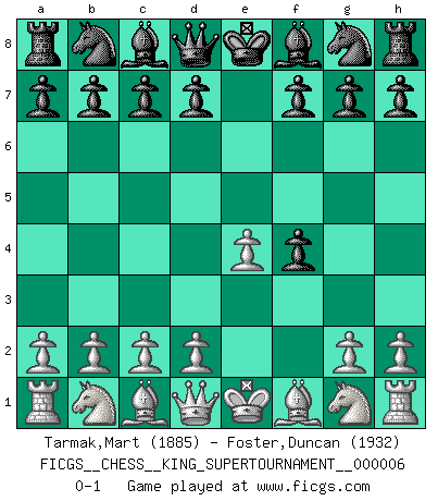 Last move : 0-1 2019 October 3 1:7:5 [Event "FICGS__CHESS__KING_SUPERTOURNAMENT__000006"] [Site "FICGS"] [Date "2019.09.02"] [Round "1"] [White "Tarmak,Mart"] [Black "Foster,Duncan"] [Result "0-1"] [WhiteElo "1885"] [BlackElo "1932"] 1.e4 e5 2.f4 exf4 0-1 This chess game has been lost on time (started : 2019.09.02 1:48:4) King's gambit accepted Player Black won this chess game. Follow this game move after move (download)There just isn't enough televised Chess. (David Letterman) Drei Punkte vor allen anderen ist wie einer, der im weißen Anzug posiert, während der Rest in Müllsäcke gekleidet dasteht. (Viktor Kortschnoi) Ayuda a tus piezas para que ellas te puedan ayudar. (Paul Morphy) Le plus grand jeu de l'esprit jamais inventé, plus vous l'apprenez, plus vous y prenez du plaisir. (Garry Kasparov) It is the aim of the modern school, not to treat every position according to one general law, but according to the principle inherent in the position. (Richard Reti)