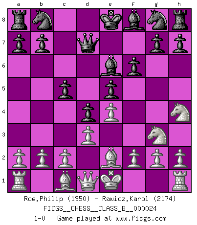 Last move : 1-0 2007 August 10 14:57:58 [Event "FICGS__CHESS__CLASS_B__000024"] [Site "FICGS"] [Date "2007.06.23"] [Round "1"] [White "Roe,Philip"] [Black "Rawicz,Karol"] [Result "1-0"] [WhiteElo "1950"] [BlackElo "2174"] 1.Nc3 d5 2.e4 d4 3.Nce2 e5 4.Ng3 Be6 5.Nf3 f6 6.Be2 c5 7.d3 Qd7 8.Nh4 1-0 This chess game has been lost on time (started : 2007.06.23 2:55:6) Dunst (Sleipner, Heinrichsen) Opening Player White won this chess game. Follow this game move after move (download)Nonsense was the last thing Fischer was interested in, as far as Chess was concerned. (Elie Agur) Dein Körper muss in Topform sein. Dein Schach verfällt, wenn dein Körper verfällt. Der Körper kann nicht vom Geist getrennt werden. (Robert James Fischer) Todo se encuentra en un estado de flujo y esto incluye al mundo del Ajedrez. (Mikhail Botvinnik) Un journaliste : 'Vous préférez avoir une dame de plus sur l'échiquier ou au lit ?' Boris Spassky : 'Ca dépend de la position.' Animated gif is worth one mega-word. (Unknown)