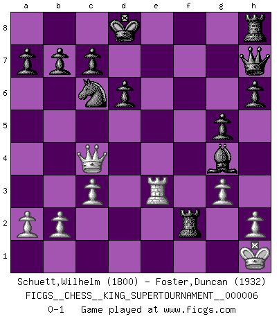 Last move : 0-1 2019 December 20 17:36:3 [Event "FICGS__CHESS__KING_SUPERTOURNAMENT__000006"] [Site "FICGS"] [Date "2019.09.02"] [Round "1"] [White "Schuett,Wilhelm"] [Black "Foster,Duncan"] [Result "0-1"] [WhiteElo "1800"] [BlackElo "1932"] 1.e4 e5 2.f4 exf4 3.Nf3 g5 4.Bc4 Bg7 5.O-O h6 6.g3 d6 7.Ne1 Qe7 8.Ng2 Bd4+ 9.Kh1 Nf6 10.c3 Bb6 11.d4 Bg4 12.Qa4+ Nc6 13.d5 f3 14.Ne3 f2 15.Rxf2 Qxe4+ 16.Kg1 Nxd5 17.Qb3 Nxe3 18.Nd2 Qh7 19.Bxf7+ Ke7 20.Kh1 Raf8 21.Nf3 Rxf7 22.Bxe3 Bxe3 23.Re1 Rxf3 24.Qc4 Rxf2 25.Rxe3+ Kd8 0-1 KGA : Hanstein gambit Kingside Castling by player White (move 5) Player Black won this chess game. Follow this game move after move (download)Excellence at Chess is one mark of a scheming mind. (Sir Arthur Conan Doyle) Ihnen, Herr Lasker, habe ich nur drei Worte zu sagen: Schach und matt. (Siegbert Tarrasch) El Ajedrez es un regaderazo frío para la mente. (Sir John Simon) Tous ces prétendus hommes politiques sont les pions, les Cavaliers, les Tours ou les Fous d'une partie d'échecs qui se jouera tant qu'un hasard ne renversera pas l'échiquier. (Honoré de Balzac) A generalist learns less and less about more and more until he knows nothing about everything. (Author unknown)