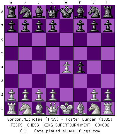 Last move : 0-1 2019 October 3 1:7:5 [Event "FICGS__CHESS__KING_SUPERTOURNAMENT__000006"] [Site "FICGS"] [Date "2019.09.02"] [Round "1"] [White "Gordon,Nicholas"] [Black "Foster,Duncan"] [Result "0-1"] [WhiteElo "1759"] [BlackElo "1932"] 1.e4 e5 2.f4 exf4 0-1 This chess game has been lost on time (started : 2019.09.02 1:48:4) King's gambit accepted Player Black won this chess game. Follow this game move after move (download)Chess holds its master in its own bonds, shackling the mind and brain so that the inner freedom of the very strongest must suffer. (Albert Einstein) Matt entspricht nicht immer den Tatsachen. (Savielly Grigorievitsch Tartakower) El tablero es el mundo, las piezas es el fenomeno del universo, las reglas del juego son lo que llamamos leyes de la naturaleza y el jugador del lado opuesto, se encuentra oculto a nuestra vista. (Thomas Huxley) Dieu déplace le joueur, et celui-ci la pièce. Quel Dieu derrière Dieu commence donc la trame ? Arturo Perez-Reverte (prix de littérature policière 1993). In every real man a child is hidden that wants to play. (Friedrich Nietzsche)