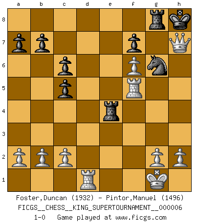 Last move : 1-0 2019 November 18 12:24:3 [Event "FICGS__CHESS__KING_SUPERTOURNAMENT__000006"] [Site "FICGS"] [Date "2019.09.02"] [Round "1"] [White "Foster,Duncan"] [Black "Pintor,Manuel"] [Result "1-0"] [WhiteElo "1932"] [BlackElo "1496"] 1.e4 e5 2.f4 Nc6 3.Nf3 Bc5 4.Nxe5 Nxe5 5.d4 d6 6.dxc5 Bg4 7.Bb5+ c6 8.Be2 Bxe2 9.Qxe2 Ng6 10.O-O dxc5 11.Nc3 Nf6 12.e5 Nd5 13.f5 Nge7 14.Ne4 O-O 15.f6 Ng6 16.fxg7 Kxg7 17.Bg5 Qc8 18.Bf6+ Nxf6 19.exf6+ Kh8 20.Ng5 Qd7 21.Rad1 Qe8 22.Qh5 Qe3+ 23.Rf2 Qxg5 24.Qxg5 Rg8 25.Qh5 Rae8 26.Rf5 Re4 27.Qxh7+ 1-0 King's gambit Kingside Castling by player White (move 10) Kingside Castling by player Black (move 14) Player White won this chess game. Follow this game move after move (download)Chess is a terrible game. If you have no center, your opponent has a freer position. If you do have a center, then you really have something to worry about ! (Siegbert Tarrasch) Die meiste Zeit treffe ich auf Gegner, die meine Enkel sein könnten. Ich bin da, um ihnen zu zeigen, dass sie von mir noch einiges lernen können. (Viktor Kortschnoi) Nos gusta pensar. (Gary Kasparov) D'abord les bases : Jouez et étudiez, puis étudiez et jouez, ensuite jouez et étudiez, puis étudiez et jouez. Deuxièmement : Donnez toujours le meilleur de vous-même ! (Ken Smith) Computers are like Old Testament gods; lots of rules and no mercy. (Joseph Campbell)