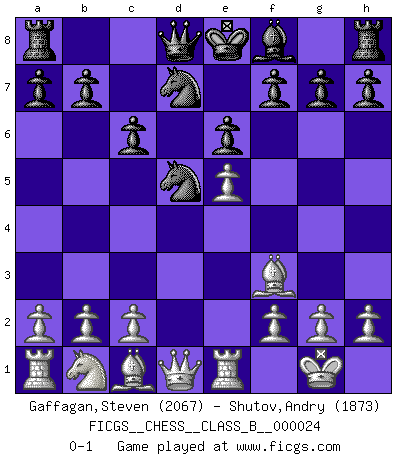 Last move : 0-1 2007 August 11 21:6:15 [Event "FICGS__CHESS__CLASS_B__000024"] [Site "FICGS"] [Date "2007.06.23"] [Round "1"] [White "Gaffagan,Steven"] [Black "Shutov,Andry"] [Result "0-1"] [WhiteElo "2067"] [BlackElo "1873"] 1.e4 Nf6 2.e5 Nd5 3.d4 d6 4.Nf3 Bg4 5.Be2 c6 6.O-O Bxf3 7.Bxf3 dxe5 8.dxe5 e6 9.Re1 Nd7 0-1 This chess game has been lost on time (started : 2007.06.23 2:55:6) Alekhine's defense : Modern, Flohr variation Kingside Castling by player White (move 6) Player Black won this chess game. Follow this game move after move (download)The mistakes are there, waiting to be made. (Savielly Tartakower) Frage des Reporters: -Welche besonderen Umstände rechtfertigen das Anhalten der Uhren während einer Turnierpartie? Antwort: -Einen Fotographen zu strangulieren. (Siegbert Tarrasch) Un Peón pasado aumenta su poder a medida de que el número de piezas en el tablero disminuye. (Capablanca) Karpov est une pièce de musée. (Garry Kasparov) How many people work in NATO Headquarters ? - About half of them. (Dirk Stikker, NATO general secretary)