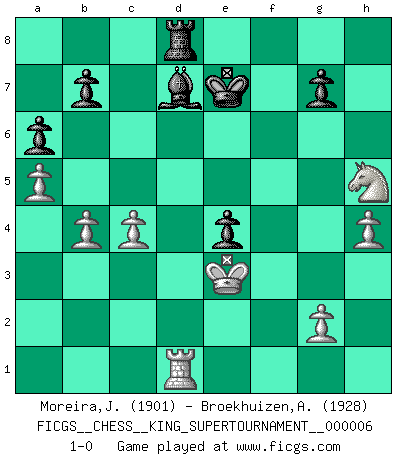 Last move : 1-0 2019 December 24 9:24:56 [Event "FICGS__CHESS__KING_SUPERTOURNAMENT__000006"] [Site "FICGS"] [Date "2019.09.02"] [Round "1"] [White "Moreira,Jose"] [Black "Broekhuizen,A. T. S."] [Result "1-0"] [WhiteElo "1901"] [BlackElo "1928"] 1.e4 e5 2.f4 exf4 3.Nf3 Nf6 4.Nc3 d5 5.exd5 Nxd5 6.Nxd5 Qxd5 7.d4 c5 8.Bb5+ Bd7 9.Qe2+ Be7 10.Bc4 Qf5 11.O-O Be6 12.Nh4 Qg4 13.Qxg4 Bxg4 14.Rxf4 Be6 15.d5 Bd7 16.Re4 Kd8 17.Nf3 Bf5 18.Re2 Bd6 19.Ne5 Rf8 20.Bb5 a6 21.Nc4 Bc7 22.Ba4 Kc8 23.d6 Bd8 24.Re5 Bd7 25.Rxc5+ Nc6 26.Bxc6 Bxc6 27.Bd2 Kd7 28.Rd1 f6 29.Ba5 Re8 30.Bxd8 Raxd8 31.Nb6+ Ke6 32.d7 Re7 33.a4 Kf7 34.b4 Re5 35.Rxe5 fxe5 36.Kf2 h5 37.h4 Ke7 38.a5 Ke6 39.c4 e4 40.Ke3 Ke7 41.Nd5+ Kf7 42.Rf1+ Ke6 43.Nf4+ Ke7 44.Nxh5 Bxd7 45.Rd1 1-0 KGA : Schallop defense Kingside Castling by player White (move 11) Player White won this chess game. Follow this game move after move (download)In order to improve your game, you must study the endgame before everything else, for whereas the endings can be studied and mastered by themselves, the middle game and the opening must be studied in relation to the endgame. (Jose Raul Capablanca) Sicherlich können nur Meister einen Stil haben. Daß ein nicht-Meister auch nur ein einziges Mal in seinem Leben eine Partie folgerecht durchführte, habe ich niemals bemerkt. (Emanuel Lasker) Personalmente, yo prefiero mirar hacia el futuro en donde un programa de computadora gane el título mundial de Ajedrez. La humanidad necesita una lección de humildad. (Richard Dawkings) Il (Jacob Murray) ne joue pas pour le bon coup, mais pour le meilleur. (Eloi Relange) Two beer, or not two beer. (Unknown)