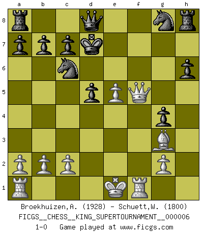 Last move : 1-0 2020 January 12 3:13:59 [Event "FICGS__CHESS__KING_SUPERTOURNAMENT__000006"] [Site "FICGS"] [Date "2019.09.02"] [Round "1"] [White "Broekhuizen,A. T. S."] [Black "Schuett,Wilhelm"] [Result "1-0"] [WhiteElo "1928"] [BlackElo "1800"] 1.e4 e5 2.f4 exf4 3.Nf3 g5 4.Bc4 Bg7 5.d4 h6 6.h4 d6 7.Qd3 Nc6 8.Nc3 g4 9.Ng1 Bxd4 10.Bxf4 Bxg1 11.Rxg1 Qxh4+ 12.Bg3 Qd8 13.Rf1 Be6 14.Bxe6 fxe6 15.e5 d5 16.Qg6+ Kd7 17.Nxd5 exd5 18.Qf5+ 1-0 King's knight's gambit Player White won this chess game. Follow this game move after move (download)A passed Pawn increases in strength as the number of pieces on the board diminishes. (Capablanca) Im Schach gibt es keinen Platz für Galanterie. (Irving Chernev) Durante una competencia de Ajedrez, un Maestro de Ajedrez deberá ser una combinación de presa de caza y un Monge. (Alexander Alekhine) L'action d'une oeuvre littéraire se déroule sur un champ de bataille. Les masques et les types du drame moderne correspondent aux pièces du jeu d'échecs. L'intrigue correspond aux coups et aux gambits, c'est à dire aux techniques du jeu telles qu'utilisées et interprétées par les joueurs. Les tactiques et les péripéties [mouvements] correspondent aux coups exécutés par l'adversaire. (Viktor Shklovsky) Creativity is inventing, experimenting, growing, taking risks, breaking rules, making mistakes, and having fun. (Mary Lou Cook)