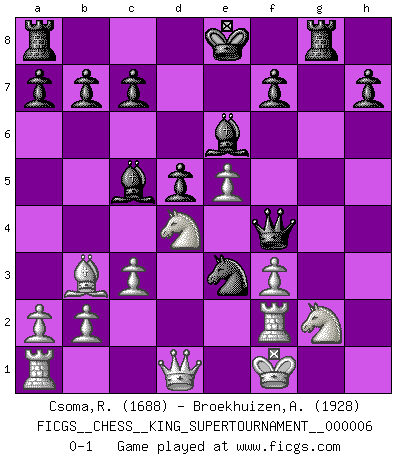 Last move : 0-1 2019 December 21 8:3:38 [Event "FICGS__CHESS__KING_SUPERTOURNAMENT__000006"] [Site "FICGS"] [Date "2019.09.02"] [Round "1"] [White "Csoma,Robert"] [Black "Broekhuizen,A. T. S."] [Result "0-1"] [WhiteElo "1688"] [BlackElo "1928"] 1.e4 e5 2.f4 exf4 3.Nf3 Nf6 4.e5 Nh5 5.Bc4 d5 6.Bb3 g5 7.O-O Nc6 8.d4 Be6 9.Nc3 g4 10.Ne1 f3 11.gxf3 g3 12.hxg3 Nxg3 13.Rf2 Rg8 14.Ng2 Nf5 15.Ne2 Qh4 16.Bf4 Ncxd4 17.Nxd4 Bc5 18.c3 Qxf4 19.Kf1 Ne3+ 0-1 KGA : Schallop defense Kingside Castling by player White (move 7) Player Black won this chess game. Follow this game move after move (download)You know you're going to lose. Even when I was ahead I knew I was going to lose. - On playing against Fischer. (Andrew Soltis) Privat ist Kortschnoi kein schlechter Mensch, sehr sympathisch. Aber während des Spiels ist er grausam. Er will dich töten. (Miguel Najdorf) EL Ajedrez es como la vida. (Boris Spassky) Aux échecs, l'amour-propre est satisfait quand on remporte la victoire, mais il n'y a pas de honte à être battu. (Benjamin Franklin) All the troubles of the world come from being unable to sit alone in a quiet room. (Blaise Pascal)