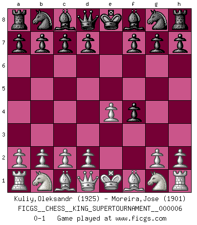 Last move : 0-1 2019 September 2 16:41:15 [Event "FICGS__CHESS__KING_SUPERTOURNAMENT__000006"] [Site "FICGS"] [Date "2019.09.02"] [Round "1"] [White "Kuliy,Oleksandr"] [Black "Moreira,Jose"] [Result "0-1"] [WhiteElo "1925"] [BlackElo "1901"] 1.e4 e5 2.f4 exf4 0-1 King's gambit accepted Player Black won this chess game. Follow this game move after move (download)It began to feel as though you were playing against Chess itself. - On playing against Robert Fischer. (Walter Shipman) Ich habe die Schachforschung dermaßen betrieben, dass sie auf eine wissenschaftliche Basis gestellt wurde. (Mikhail Moiseyevich Botvinik) Cuando me preguntan: -¿Cual es el secreto que te hace hacer mejores movidas que tus oponentes?, Yo respondo: Me da gusto que me pregunten eso, porque, como veran, hay una simple razón. Yo pienso mis propias movidas y dejo a mi oponente que el piense las suyas. (Alexander Alekhine) La solitude du joueur d'Echecs à l'approche du mat est semblable à celle du condamné. (Francis Szpiner) When you've done things right people won't know you've done anything at all. (Futurama)