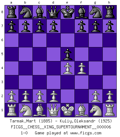 Last move : 1-0 2019 September 2 8:43:28 [Event "FICGS__CHESS__KING_SUPERTOURNAMENT__000006"] [Site "FICGS"] [Date "2019.09.02"] [Round "1"] [White "Tarmak,Mart"] [Black "Kuliy,Oleksandr"] [Result "1-0"] [WhiteElo "1885"] [BlackElo "1925"] 1.e4 e5 2.f4 1-0 King's gambit Player White won this chess game. Follow this game move after move (download)Chess is a terrific way for kids to build self image and self esteem. (Saudin Robovic) Ein Remis kann durch Wiederholung von drei Zügen oder durch einen schlechte Zug erreicht werden. (Savielly Grigorievitsch Tartakower) Yo creo que el Ajedrez posee una magia que es también una ayuda en la edad avanzada. Una rodilla reumática es olvidada durante una partida de Ajedrez y otros eventos pueden parecer algo sin importancia comparada a una catástrofe en el tablero de Ajedrez. (Vlastimil Hort) D'abord les bases : Jouez et étudiez, puis étudiez et jouez, ensuite jouez et étudiez, puis étudiez et jouez. Deuxièmement : Donnez toujours le meilleur de vous-même ! (Ken Smith) I know the human being and fish can coexist peacefully. (George W. Bush, Saginaw sept. 29, 2000)