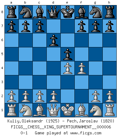 Last move : 0-1 2019 September 18 16:44:8 [Event "FICGS__CHESS__KING_SUPERTOURNAMENT__000006"] [Site "FICGS"] [Date "2019.09.02"] [Round "1"] [White "Kuliy,Oleksandr"] [Black "Pech,Jaroslav"] [Result "0-1"] [WhiteElo "1925"] [BlackElo "1820"] 1.e4 e5 2.f4 d6 0-1 King's gambit Player Black won this chess game. Follow this game move after move (download)Chess is a more highly symbolic game, but the aggressions are therefore even more frankly represented in the play. It probably began as a war game; that is, the representation of a miniature battle between the forces of two kingdoms. (Karl Meninger) Frage: Was machen Sie mit den Preisen? Anwort: Ich habe Angst, dass meine Freundin davon neue Kleider kauft. (Loek van Wely) El muchacho (en ese entonces un niño de 12 años llamado Anatoly Karpov) no tiene ni idea de lo que es el Ajedrez y no hay futuro en absoluto para el en esta profesión. (Mikhail Botvinnik) C'est la seule position que je connaisse où les deux camps sont mals. Propos prêtés à V. Anand. To steal ideas from one person is plagiarism. To steal from many is research. (Unknown)