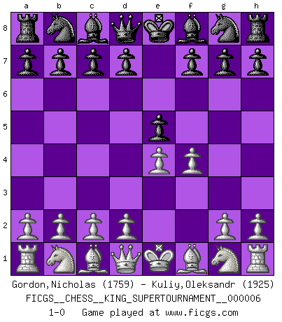 Last move : 1-0 2019 September 2 8:43:46 [Event "FICGS__CHESS__KING_SUPERTOURNAMENT__000006"] [Site "FICGS"] [Date "2019.09.02"] [Round "1"] [White "Gordon,Nicholas"] [Black "Kuliy,Oleksandr"] [Result "1-0"] [WhiteElo "1759"] [BlackElo "1925"] 1.e4 e5 2.f4 1-0 King's gambit Player White won this chess game. Follow this game move after move (download)Pawns: they are the soul of this game, they alone form the attack and defense. (Philidor) Woher wissen wir, daß der Neanderthaler Blindschach gespielt hat? -- Bei Ausgrabungen wurden keine Schachbretter und Figuren gefunden. (Anonymous) Durante una competencia de Ajedrez, un Maestro de Ajedrez deberá ser una combinación de presa de caza y un Monge. (Alexander Alekhine) Ce qui caractérise les parties de combat, c'est que si le défenseur a constamment de difficiles problèmes à résoudre, l'attaquant doit chercher sans relâche de nouvelles possibilités d'attaque. (Koblentz) Perception is reality. (Immanuel Kant)
