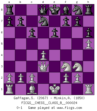Last move : 0-1 2007 September 19 20:59:28 [Event "FICGS__CHESS__CLASS_B__000024"] [Site "FICGS"] [Date "2007.06.23"] [Round "1"] [White "Gaffagan,Steven"] [Black "Minkin,Alexander"] [Result "0-1"] [WhiteElo "2067"] [BlackElo "1850"] 1.e4 c6 2.d4 d5 3.Nd2 dxe4 4.Nxe4 Bf5 5.Ng3 Bg6 6.Nf3 Nd7 7.h4 h6 8.h5 Bh7 9.Bd3 Bxd3 10.Qxd3 e6 0-1 This chess game has been lost on time (started : 2007.06.23 2:55:6) Caro-Kann : 3.Nd2 Player Black won this chess game. Follow this game move after move (download)Bobby Fischer is the greatest Chess genius of all time ! (Alexander Kotov) Es ist besser die Steine des Gegners zu opfern. (Savielly Grigorievitsch Tartakower) Las combinaciones han sido siempre el aspecto más intrigante del Ajedrez. Los Maestros las buscan, el público las aplauden, los críticos las alaban. La razón se debe a que las combinaciones hacen posible que el Ajedrez sea más que un ejercicio matemático con una carencia de vida. Ellas son la poesía del juego, son del Ajedrez lo que la melodía es de la música. Ellas representan el triunfo de la mente sobre la materia. (Reuben Fine) Ce qui caractérise les parties de combat, c'est que si le défenseur a constamment de difficiles problèmes à résoudre, l'attaquant doit chercher sans relâche de nouvelles possibilités d'attaque. (Koblentz) Nobody is always a winner, and anybody who says he is, is either a liar or doesn't play poker. (Amarillo Slim)