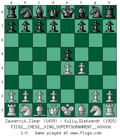 Last move : 1-0 2019 September 2 8:44:14 [Event "FICGS__CHESS__KING_SUPERTOURNAMENT__000006"] [Site "FICGS"] [Date "2019.09.02"] [Round "1"] [White "Zaunercik,Ilmar"] [Black "Kuliy,Oleksandr"] [Result "1-0"] [WhiteElo "1439"] [BlackElo "1925"] 1.e4 e5 2.f4 1-0 King's gambit Player White won this chess game. Follow this game move after move (download)No Chess Grandmaster is normal; they only differ in the extent of their madness. (Viktor Korchnoi) Bis zum Jahr 1971 verlief in meiner Schachkariere alles glatt. Dieses dramatische Match [Fischer-Taimanov 6:0] machte mein Leben zur Hölle. (Mark Taimanov) Observen a Garry Kasparov. Después de una derrota, invariablemente el gana la próxima partida. Prácticamente hace pedazos a su siguiente oponente. Eso es algo que tenemos que aprender a lograr. (Maurice Ashley) Le jeu d'échecs fait naître et fortifie en nous plusieurs qualités précieuses dans le cours de l'existence, telles que la prévoyance, la circonspection, la prudence, et la persévérance. (Benjamin Franklin - 1783, la morale des échecs) I can't decide which is riskier; taking crazy risks, or taking advice on crazy risks from a crazy risk taker. (Gregory House in House M.D.)