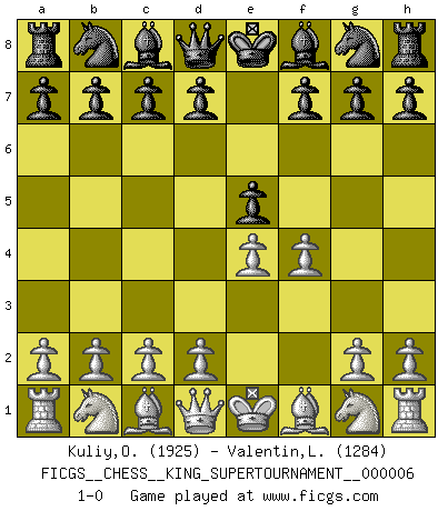 Last move : 1-0 2019 October 2 12:52:30 [Event "FICGS__CHESS__KING_SUPERTOURNAMENT__000006"] [Site "FICGS"] [Date "2019.09.02"] [Round "1"] [White "Kuliy,Oleksandr"] [Black "Valentin,Laurentiu"] [Result "1-0"] [WhiteElo "1925"] [BlackElo "1284"] 1.e4 e5 2.f4 1-0 This chess game has been lost on time (started : 2019.09.02 1:48:4) King's gambit Player White won this chess game. Follow this game move after move (download)Spassky will not be psyched out by Fischer. (Mike Goodall) Ich glaube nicht an Psychologie, ich glaube an gute Züge. (Robert James Fischer) Cuando no sepas que mover, espera por una idea que se le venga a la la cabeza de tu oponente. Tenlo por seguro de que esa idea estará incorrecta. (Siegbert Tarrasch) J'ai vu le vaincu d'Echecs jouer des années durant dans l'espoir de la fête de la victoire. Car tu es plus riche de ce qu'elle existe si même elle n'est point pour toi. Ainsi de la perle du fond des mers. (Antoine de Saint-Exupéry) There are two major products that came out of Berkeley: LSD and UNIX. We do not believe this is to be a coincidence. (Jeremy S. Anderson)