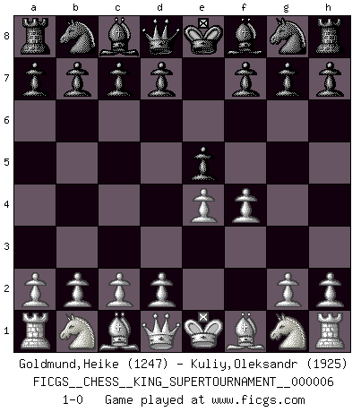 Last move : 1-0 2019 September 2 8:44:22 [Event "FICGS__CHESS__KING_SUPERTOURNAMENT__000006"] [Site "FICGS"] [Date "2019.09.02"] [Round "1"] [White "Goldmund,Heike"] [Black "Kuliy,Oleksandr"] [Result "1-0"] [WhiteElo "1247"] [BlackElo "1925"] 1.e4 e5 2.f4 1-0 King's gambit Player White won this chess game. Follow this game move after move (download)If I win a tournament, I win it by myself. I do the playing. Nobody helps me. (Bobby Fischer) Alle offensichtlichen Züge sehen nach dem Spiel in der Analyse verdächtig aus. (Viktor Kortschnoi) En posiciones complicadas, Bobby Fischer pocas veces tuvo que temer de cualquiera. (Paul Keres) Le joueur d'Echecs qui veut atteindre le top est obligé de développer son propre credo créatif. Alexeï Stepanovicth Souétine. Il est facile d'écrire des livres ! Ce qui est difficile, c'est de jouer ! (Alexeï Stepanovicth Souétine) Watch your thoughts; they become words. Watch your words; they become actions. Watch your actions; they become habits. Watch your habits; they become character. Watch your character; it becomes your destiny. (Frank Outlaw)