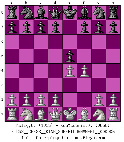 Last move : 1-0 2019 October 2 12:52:30 [Event "FICGS__CHESS__KING_SUPERTOURNAMENT__000006"] [Site "FICGS"] [Date "2019.09.02"] [Round "1"] [White "Kuliy,Oleksandr"] [Black "Koutsounis,Vassilios"] [Result "1-0"] [WhiteElo "1925"] [BlackElo "0868"] 1.e4 e5 2.f4 1-0 This chess game has been lost on time (started : 2019.09.02 1:48:4) King's gambit Player White won this chess game. Follow this game move after move (download)When you are lonely, when you feel yourself an alien in the world, play Chess. This will raise your spirits and be your counselor in war. (Aristotle) Alles was am Schachbrett zählt sind gute Züge. (Robert James Fischer) Tu no necesitas jugar muy bien, únicamente ayudar a tu oponenet a que juegue muy mal. (Genrikh Chepukaitis) Plusieurs personnes se sont demandées comment Tal faisait pour gagner... En fait, c'est très simple ! Il met ses pièces au centre de l'échiquier et les sacrifie quelque part ! (David Bronstein) Internal peace cannot coexist with external war. (Don Groves)