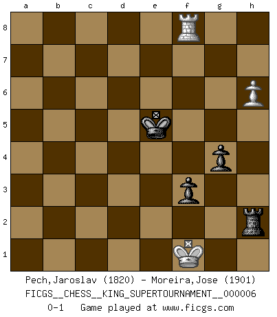 Last move : 0-1 2019 December 25 0:8:41 [Event "FICGS__CHESS__KING_SUPERTOURNAMENT__000006"] [Site "FICGS"] [Date "2019.09.02"] [Round "1"] [White "Pech,Jaroslav"] [Black "Moreira,Jose"] [Result "0-1"] [WhiteElo "1820"] [BlackElo "1901"] 1.e4 e5 2.f4 exf4 3.Nf3 d6 4.d4 g5 5.h4 g4 6.Ng1 Bh6 7.Nc3 c6 8.Nge2 Qf6 9.g3 f3 10.Nf4 Qe7 11.Nh5 Bxc1 12.Qxc1 Nf6 13.Qg5 Nxh5 14.Qxh5 Qe6 15.Bd3 Na6 16.d5 Qe5 17.Qxe5+ dxe5 18.Bxa6 bxa6 19.Kf2 Bb7 20.Rhd1 cxd5 21.Nxd5 O-O-O 22.Nf6 h5 23.c4 Kc7 24.Rac1 a5 25.Ke3 Bc6 26.Rxd8 Kxd8 27.Rd1+ Kc8 28.b3 Kc7 29.Nd5+ Kb7 30.Nf6 Kb6 31.Nd7+ Bxd7 32.Rxd7 a4 33.Rxf7 Rd8 34.Rf6+ Kc7 35.Rf7+ Kc8 36.Rxa7 Rd1 37.bxa4 Re1+ 38.Kf2 Rxe4 39.Re7 Re2+ 40.Kf1 e4 41.a5 Kd8 42.Re5 Rxa2 43.Rxe4 Rxa5 44.Re1 Kd7 45.Rd1+ Kc6 46.Rd2 Kc5 47.Rd5+ Kb4 48.Rd1 Kxc4 49.Rc1+ Kd4 50.Rd1+ Ke4 51.Re1+ Kd4 52.Rd1+ Ke3 53.Re1+ Kd3 54.Rd1+ Kc3 55.Rc1+ Kd2 56.Rc8 Ke3 57.Re8+ Kd4 58.Rd8+ Ke5 59.Rh8 Kd4 60.Rd8+ Ke4 61.Re8+ Kf5 62.Rf8+ Ke4 63.Re8+ Kf5 64.Rf8+ Ke5 65.Rh8 Kf6 66.Rf8+ Ke7 67.Rh8 Ra1+ 68.Kf2 Ra2+ 69.Kf1 Rg2 70.Rxh5 Rxg3 71.Rf5 Ke6 72.Rf8 Rg2 73.h5 Ke5 74.h6 Rh2 0-1 KGA : Fischer defense Queenside Castling by player Black (move 21) 10 pieces endgame at move 43 : White KRPPP , Black KRPPP WHITE : King + 1 Rook 3 Pawns BLACK : King + 1 Rook 3 Pawns 9 pieces endgame at move 48 : White KRPP , Black KRPPP WHITE : King + 1 Rook 2 Pawns BLACK : King + 1 Rook 3 Pawns 8 pieces endgame at move 70 : White KRPP , Black KRPP WHITE : King + 1 Rook 2 Pawns BLACK : King + 1 Rook 2 Pawns 7 pieces endgame at move 70 : White KRP , Black KRPP WHITE : King + 1 Rook 1 Pawn BLACK : King + 1 Rook 2 Pawns Player Black won this chess game. Follow this game move after move (download)We like to think. (Gary Kasparov) Viele Opfer benötigen überhaupt keine konkrete Berechnung. Es genügt sich die entstehende Position kurz vorzustellen, um uns davon zu überzeugen, dass das Opfer korrekt ist. (Mikhail Nekhemyevich Tal) El Ajedrez es un mar en el cual un mosquito puede beber y un elefante puede bañarse. (Refrán Hindú) Il n'y a pas eu de défaite parce que je ne crois pas que cet ordinateur ait jamais existé. IBM a triché en refusant d'imprimer les modes de recherche de la machine. C'est évident, pendant le match, des coups décisifs ont été joués par des êtres humains. Aujourd'hui, les meilleurs spécialistes en informatique ne peuvent toujours pas expliquer comment Deep-Blue a pu jouer contre la logique des ordinateurs. IBM a gagné une guerre de communication, mais ils sont incapables de prouver que l'ordinateur a gagné tout seul. (Garry Kasparov) You cannot beat a roulette table unless you steal money from it. (Albert Einstein)