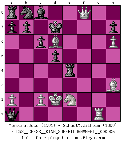 Last move : 1-0 2019 October 25 23:17:12 [Event "FICGS__CHESS__KING_SUPERTOURNAMENT__000006"] [Site "FICGS"] [Date "2019.09.02"] [Round "1"] [White "Moreira,Jose"] [Black "Schuett,Wilhelm"] [Result "1-0"] [WhiteElo "1901"] [BlackElo "1800"] 1.e4 e5 2.f4 exf4 3.Nf3 g5 4.h4 g4 5.Ne5 Nf6 6.Nxg4 Rg8 7.Nxf6+ Qxf6 8.Nc3 c6 9.Qf3 Bh6 10.g4 d5 11.g5 Qe7 12.gxh6 f5 13.d3 fxe4 14.dxe4 Rg4 15.Bxf4 Qf6 16.Ne2 Rxh4 17.Rg1 Qxb2 18.Bd6 Qxa1+ 19.Kd2 Rxe4 20.Qf8+ Kd7 21.Bh3+ 1-0 KGA : Kieseritsky, Berlin defense Player White won this chess game. Follow this game move after move (download)I prefer to lose a really good game than to win a bad one. (David Levy) Charakterschwächen offenbaren sich normalerweise während einer Schachpartie. (Garry Kasparov) El Ajedrez no es una pizca de inferior al violín, y tenemos un gran número de violinistas profesionales. (Mikhail Botvinnik) Nous vivons dans un monde échiquéen : chaque jour qui passe est un défi à relever. (Philosophe Sasha) All art requires courage. (Anne Tucker)