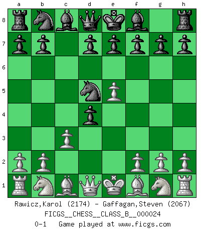 Last move : 0-1 2007 August 22 17:3:47 [Event "FICGS__CHESS__CLASS_B__000024"] [Site "FICGS"] [Date "2007.06.23"] [Round "1"] [White "Rawicz,Karol"] [Black "Gaffagan,Steven"] [Result "0-1"] [WhiteElo "2174"] [BlackElo "2067"] 1.e4 c5 2.c3 Nf6 3.e5 Nd5 4.d4 cxd4 0-1 This chess game has been lost on time (started : 2007.06.23 2:55:6) Sicilian : Alapin's variation (2.c3) Player Black won this chess game. Follow this game move after move (download)Discovered check is the dive bomber of the Chessboard. (Reuben Fine) Man kann eine Schachpartie nur gewinnen, wenn das Gleichgewicht gestört ist. In einer Stellung mit ungestörtem Gleichgewicht ist auch das größte Genie hilflos - in der Stellung steckt dann eben kein genialer Einfall. (Wilhelm Steinitz) El Ajedrez hace al hombre ser mas sabio y ver mas claro. (Vladimir Putin) Même un GMI sait rarement calculer sur plus de cinq coups une attaque à sacrifices. (Rudolf Spielmann) Luck is when opportunity knocks and you answer. (Anonymous)