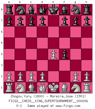 Last move : 0-1 2019 October 3 1:7:5 [Event "FICGS__CHESS__KING_SUPERTOURNAMENT__000006"] [Site "FICGS"] [Date "2019.09.02"] [Round "1"] [White "Zhogov,Yury"] [Black "Moreira,Jose"] [Result "0-1"] [WhiteElo "1800"] [BlackElo "1901"] 1.e4 e5 2.f4 exf4 0-1 This chess game has been lost on time (started : 2019.09.02 1:48:4) King's gambit accepted Player Black won this chess game. Follow this game move after move (download)Chess mastery essentially consists of analyzing Chess positions accurately. (Mikhail Botvinnik) Die Elozahlen sind sehr schlecht für das Schach. Jetzt ist Schach eine Sportindustrie, die darauf zielt Elopunkte zu machen. (Miguel Najdorf) No soy una persona materialista y por eso, no resiento la falta o pérdida del dinero. La ausencia de cosas mundanas carece de importancia. Ya que el Ajedrez es una forma en la que puedo ser tan materialista como yo desee sin tener la necesidad de vender mi alma. (Jamie Walter Adams) L'attaque fait le spectacle, la défense gagne les matchs. (Dicton footballistique) I've lost money so fast in these clubs it's left me reeling. I've read every poker book ever written, but the only way to get better at the game is to go out and play with people who are really good. The problem is, you stand to lose a lot of money doing it. (Matt Damon)