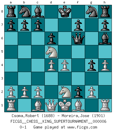 Last move : 0-1 2019 September 3 17:36:53 [Event "FICGS__CHESS__KING_SUPERTOURNAMENT__000006"] [Site "FICGS"] [Date "2019.09.02"] [Round "1"] [White "Csoma,Robert"] [Black "Moreira,Jose"] [Result "0-1"] [WhiteElo "1688"] [BlackElo "1901"] 1.e4 e5 2.f4 exf4 3.Nf3 d6 4.d4 g5 5.h4 g4 6.Ng1 Bh6 7.Ne2 Qf6 8.Nbc3 f3 9.Nd5 f2+ 0-1 KGA : Fischer defense Player Black won this chess game. Follow this game move after move (download)Everything is in a state of flux, and this includes the world of Chess. (Mikhail Botvinnik) Es ist peinlich, dass ich nie Weltmeister wurde. Es wäre leicht, Leonid Breschnjew als Ursache vorzuschieben, dessen Apparat den Vorzeigekommunisten Anatoli Karpow in allem unterstützte. Aber Garri Kasparow zum Beispiel, der ebenfalls von den Sowjets unerwünscht war, hat trotz der Widerstände den WM-Titel erobert. (Viktor Kortschnoi) Yo no le temo a Spassky. Todos saben que yo soy el mejor. Uno no necesita un torneo para probarlo. (Bobby Fischer) Dieu déplace le joueur, et celui-ci la pièce. Quel Dieu derrière Dieu commence donc la trame ? Arturo Perez-Reverte (prix de littérature policière 1993). No, I am still playing. (Anatoly Karpov)