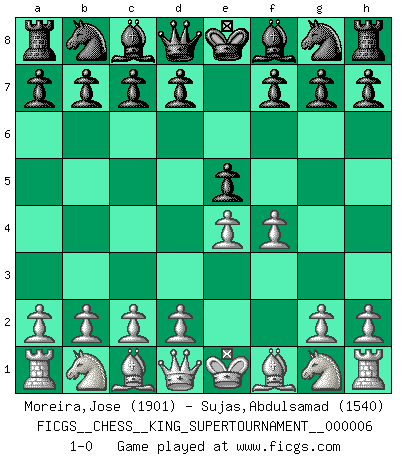 Last move : 1-0 2019 October 2 12:52:30 [Event "FICGS__CHESS__KING_SUPERTOURNAMENT__000006"] [Site "FICGS"] [Date "2019.09.02"] [Round "1"] [White "Moreira,Jose"] [Black "Sujas,Abdulsamad"] [Result "1-0"] [WhiteElo "1901"] [BlackElo "1540"] 1.e4 e5 2.f4 1-0 This chess game has been lost on time (started : 2019.09.02 1:48:4) King's gambit Player White won this chess game. Follow this game move after move (download)All Chess players should have a hobby. (Savielly Tartakower) Wenn ich gewinne bin ich ein Genie. Wenn nicht, dann bin ich keines. (Robert James Fischer) Ayuda a tus piezas para que ellas te puedan ayudar. (Paul Morphy) Ne tendez aucun piège pour le plaisir ! Ne jouez rien dans l'espoir que l'adversaire réagisse de façon stupide ! Prenez toujours pour acquis que l'adversaire va trouver le meilleur coup ! Ne jouez jamais de coup dans l'espoir que l'adversaire ne voie pas la menace ! Chacun de vos coups doit améliorer la position d'une façon ou d'une autre. Whenever people agree with me, I always feel I must be wrong. (Oscar Wilde)