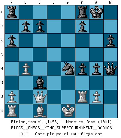 Last move : 0-1 2019 September 6 20:31:46 [Event "FICGS__CHESS__KING_SUPERTOURNAMENT__000006"] [Site "FICGS"] [Date "2019.09.02"] [Round "1"] [White "Pintor,Manuel"] [Black "Moreira,Jose"] [Result "0-1"] [WhiteElo "1496"] [BlackElo "1901"] 1.e4 e5 2.f4 exf4 3.Nf3 d6 4.Bc4 h6 5.d4 g5 6.O-O Nc6 7.c3 Nf6 8.Nbd2 Bg7 9.h4 Nh5 10.b4 g4 11.Rf2 a6 12.Qb3 O-O 13.e5 dxe5 14.Nxe5 Nxe5 15.dxe5 Bxe5 16.Ne4 Qxh4 17.Kf1 Bf5 18.Bd3 Bxe4 19.Bxe4 Ng3+ 20.Ke1 Nxe4 21.Qc2 Bxc3+ 0-1 KGA : Fischer defense Kingside Castling by player White (move 6) Kingside Castling by player Black (move 12) Player Black won this chess game. Follow this game move after move (download)Chess is really ninety nine percent calculation. (Soltis) Gott hat gewollt, dass ich Champion werde. (Surab Azmajparaschvili) Botvinnik trataba de restarle el misterio al Ajedrez, siempre relacionandolo a situaciones de la vida ordinaria. El gustaba de llamar al Ajedrez un típico problema inexacto similar a aquellos de los cuales la gente siempre tiene que enfrentarse en la vida cotidiana. (Garry Kasparov) La solitude du joueur d'Echecs à l'approche du mat est semblable à celle du condamné. (Francis Szpiner) If you know the enemy and know yourself you need not fear the results of a hundred battles. (Sun Tzu)