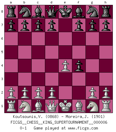 Last move : 0-1 2019 October 3 1:7:5 [Event "FICGS__CHESS__KING_SUPERTOURNAMENT__000006"] [Site "FICGS"] [Date "2019.09.02"] [Round "1"] [White "Koutsounis,Vassilios"] [Black "Moreira,Jose"] [Result "0-1"] [WhiteElo "0868"] [BlackElo "1901"] 1.e4 e5 2.f4 exf4 0-1 This chess game has been lost on time (started : 2019.09.02 1:48:4) King's gambit accepted Player Black won this chess game. Follow this game move after move (download)There is no remorse like the remorse of Chess. (H. G. Wells) Spielt Blackmar-Diemer-Gambit, und das Matt kommt von selbst! (Emil Joseph Diemer) Yo considero que Fischer es uno de los expertos mas grandes de aperturas de siempre. (Keith Hayward) Pour moi, les échecs ne sont pas un jeu mais un art. (Alexandre Alekhine) There is far too much law for those who can afford it and far too little for those who cannot. (Derek Bok)