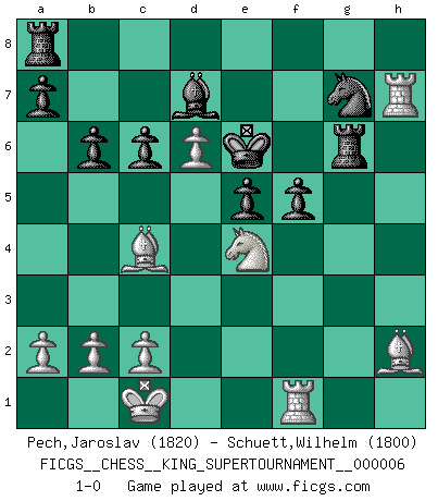Last move : 1-0 2019 December 21 13:10:57 [Event "FICGS__CHESS__KING_SUPERTOURNAMENT__000006"] [Site "FICGS"] [Date "2019.09.02"] [Round "1"] [White "Pech,Jaroslav"] [Black "Schuett,Wilhelm"] [Result "1-0"] [WhiteElo "1820"] [BlackElo "1800"] 1.e4 e5 2.f4 exf4 3.Nf3 g5 4.h4 g4 5.Ne5 d6 6.Nxg4 Nf6 7.Nxf6+ Qxf6 8.Nc3 c6 9.Qf3 Rg8 10.Qf2 Bh6 11.Be2 Na6 12.d3 Rg3 13.Bd2 Nc5 14.Rf1 Qxh4 15.d4 Ne6 16.O-O-O Bd7 17.d5 Ng7 18.Rh1 Qg5 19.Rxh6 Rxg2 20.Qxf4 Qxf4 21.Bxf4 Rg6 22.Rxh7 Ke7 23.e5 dxe5 24.d6+ Kf6 25.Ne4+ Kf5 26.Bh2 b6 27.Bd3 Ke6 28.Rf1 f5 29.Bc4+ 1-0 KGA : Kieseritsky, Kolisch defense Queenside Castling by player White (move 16) Player White won this chess game. Follow this game move after move (download)A good sacrifice is one that is not necessarily sound but leaves your opponent dazed and confused. (Rudolph Spielmann) Ihnen, Herr Lasker, habe ich nur drei Worte zu sagen: Schach und matt. (Siegbert Tarrasch) Tu eres para mi la Reina en d8 y yo soy el Peón en d7!!. (GM Eduard Gufeld) La guerre est enfant de la passion, la passion est enfant du narcissisme et le narcissisme est l'enfant. (...) Une autre partie ? (Thibault de Vassal) The large trees attract high winds. (Chinese proverb)