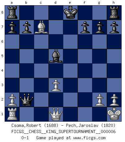 Last move : 0-1 2019 November 24 16:51:13 [Event "FICGS__CHESS__KING_SUPERTOURNAMENT__000006"] [Site "FICGS"] [Date "2019.09.02"] [Round "1"] [White "Csoma,Robert"] [Black "Pech,Jaroslav"] [Result "0-1"] [WhiteElo "1688"] [BlackElo "1820"] 1.e4 e5 2.f4 d5 3.Nf3 dxe4 4.Nxe5 Bd6 5.Bc4 Nh6 6.O-O Bxe5 7.fxe5 Qd4+ 8.Kh1 Qxc4 9.d3 exd3 10.cxd3 Qh4 11.Nc3 Ng4 12.Bf4 Nf2+ 13.Rxf2 Qxf2 14.Bg3 Qxb2 15.Nd5 Na6 16.e6 Bxe6 17.Nxc7+ Nxc7 18.Bxc7 Bd5 0-1 KGD : Falkbeer, Tartakower variation Kingside Castling by player White (move 6) Player Black won this chess game. Follow this game move after move (download)Nowadays, when you're not a grandmaster at 14, you can forget about it. (Anand Viswanathan) Das Schach ist nichts für kleine Geister, es beansprucht einen vollen Mann, der sich nicht sklavisch an das Überlieferte hält, sondern selbständig die Tiefen des Spiels zu ergründen sucht. (Wilhelm Steinitz) Cualquier cambio de material en una posición debe venir por medio de un mate, una captura o promoción de Peón. (Purdy) Celui qui prend des risques peut perdre, celui qui n'en prend pas perd toujours. (Xavier Tartacover) There are two kinds of tragedy in this world, one is not getting what you want and the other is getting. (Lord of war)