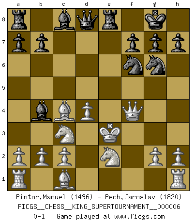 Last move : 0-1 2019 October 14 18:48:18 [Event "FICGS__CHESS__KING_SUPERTOURNAMENT__000006"] [Site "FICGS"] [Date "2019.09.02"] [Round "1"] [White "Pintor,Manuel"] [Black "Pech,Jaroslav"] [Result "0-1"] [WhiteElo "1496"] [BlackElo "1820"] 1.e4 e5 2.f4 d5 3.exd5 exf4 4.d4 Qh4+ 5.Kd2 Qd8 6.Nc3 Nf6 7.Bc4 c6 8.Qf3 Bb4 9.dxc6 Nxc6 10.Nge2 O-O 11.Qxf4 Re8 12.Kd3 Ne5+ 13.Ke3 Ng6 0-1 KGD : Falkbeer counter-gambit Kingside Castling by player Black (move 10) Player Black won this chess game. Follow this game move after move (download)I play correspondence chess because it is both art and science while chess is art only. (A player at FICGS) Es hat in meinem Leben Zeiten gegeben, da ich sehr nahe daran war zu glauben, daß ich auch nicht eine einzige Schachpartie verlieren könnte. (José Raúl Capablanca) Existen dos clases de sacrificios: los correctos y los míos. (Mikhail Tal) Il vaut toujours mieux jouer un plan faux de façon logique que de n'avoir pas de plan du tout. (Victor Kortchnoï) Mandala - that's it! 16x16 squares as multiple of the four and the eight because of the Four Noble Truths and the Noble Eightfold Path. (Heinz-Georg Lehnhoff about Big Chess)