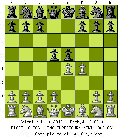 Last move : 0-1 2019 October 19 1:56:29 [Event "FICGS__CHESS__KING_SUPERTOURNAMENT__000006"] [Site "FICGS"] [Date "2019.09.02"] [Round "1"] [White "Valentin,Laurentiu"] [Black "Pech,Jaroslav"] [Result "0-1"] [WhiteElo "1284"] [BlackElo "1820"] 1.e4 e5 2.f4 d5 0-1 This chess game has been lost on time (started : 2019.09.02 1:48:4) KGD : Falkbeer counter-gambit Player Black won this chess game. Follow this game move after move (download)One bad move nullifies forty good ones. (Horowitz) Wer der Ansicht ist, daß alle Schachspieler verrückt sind, wird durch Studium des Lebens von Emil Josef Diemer nicht auf andere Gedanken kommen. (Hans Ree) Un buen sacrificio es aquel que aunque no sea necesariamente sólido, deja a tu oponente aturdido y confuso. (Rudolph Spielmann) J'ai toujours senti une vague pitié pour l'homme qui ne connaît rien aux échecs, tout comme j'en aurais pour un homme ignorant de l'amour. Les Echecs, comme la musique ou comme l'amour, ont le pouvoir de rendre heureux. (Siegbert Tarrasch) They say in chess you've got to kill the queen, and then you mate it... Oh I, do you ? (Red Hot Chili Peppers, Fortune faded)