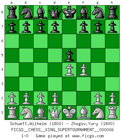 Last move : 1-0 2019 October 2 12:52:30 [Event "FICGS__CHESS__KING_SUPERTOURNAMENT__000006"] [Site "FICGS"] [Date "2019.09.02"] [Round "1"] [White "Schuett,Wilhelm"] [Black "Zhogov,Yury"] [Result "1-0"] [WhiteElo "1800"] [BlackElo "1800"] 1.e4 e5 2.f4 1-0 This chess game has been lost on time (started : 2019.09.02 1:48:4) King's gambit Player White won this chess game. Follow this game move after move (download)Discovered check is the dive bomber of the Chessboard. (Reuben Fine) Ich habe die besten Aussichten, den ersten Preis zu gewinnen - denn jeder muss gegen Steinitz spielen, nur ich nicht! (Wilhelm Steinitz) Sin errores no puede haber brillantez. (Emanuel Lasker) Votre prénom est 'Tactique', votre deuxième prénom est 'Tactique' et votre nom est 'Tactique'. (Ken Smith) Creativity is allowing yourself to make mistakes. Art is knowing which ones to keep. (Scott Adams)