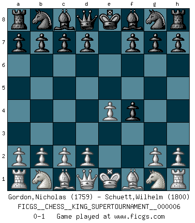 Last move : 0-1 2019 October 2 12:52:30 [Event "FICGS__CHESS__KING_SUPERTOURNAMENT__000006"] [Site "FICGS"] [Date "2019.09.02"] [Round "1"] [White "Gordon,Nicholas"] [Black "Schuett,Wilhelm"] [Result "0-1"] [WhiteElo "1759"] [BlackElo "1800"] 1.e4 e5 2.f4 exf4 0-1 This chess game has been lost on time (started : 2019.09.02 1:48:4) King's gambit accepted Player Black won this chess game. Follow this game move after move (download)Chess is a sea in which a gnat may drink and an elephant may bathe. (Hindu proverb) Wenn es im Universum noch irgendwo intelligente Lebewesen gibt, dann kennen sie Go. (Emanuel Lasker) Uno por uno, yo los acribillé, mi superioridad muy pronto se volvio aparente. (Jose Capablanca) Mais l'homme est une créature légère et illogique : semblable au joueur d'échecs, il n'aime que le processus du but à atteindre, non le but lui-même. (Dostoïevsky) It is not true that people stop pursuing dreams because they grow old, they grow old because they stop pursuing dreams. (Gabriel Garcia Marquez)