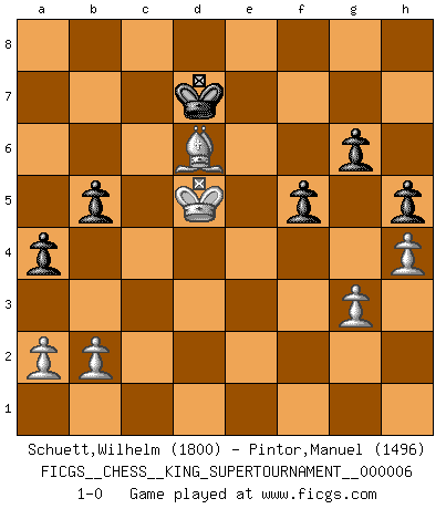 Last move : 1-0 2019 October 31 20:15:34 [Event "FICGS__CHESS__KING_SUPERTOURNAMENT__000006"] [Site "FICGS"] [Date "2019.09.02"] [Round "1"] [White "Schuett,Wilhelm"] [Black "Pintor,Manuel"] [Result "1-0"] [WhiteElo "1800"] [BlackElo "1496"] 1.e4 e5 2.f4 Nc6 3.Nf3 Bc5 4.fxe5 Nxe5 5.Nxe5 Qh4+ 6.g3 Qxe4+ 7.Qe2 Qxh1 8.Ng6 Ne7 9.Nxh8 d6 10.c3 Be6 11.d4 Bb6 12.Qh5 Qe4+ 13.Be2 Qc2 14.Nd2 Nf5 15.Qf3 O-O-O 16.Bd3 Nxd4 17.Bxc2 Nxf3+ 18.Nxf3 Rxh8 19.Nd4 Bxd4 20.cxd4 g6 21.Bg5 f5 22.Kd2 Kd7 23.Re1 Re8 24.Kc3 c6 25.Bb3 a5 26.d5 Bxd5 27.Rxe8 Kxe8 28.Bxd5 cxd5 29.Kd4 Kd7 30.Kxd5 h5 31.Bf4 a4 32.Bxd6 b5 33.h4 1-0 King's gambit Queenside Castling by player Black (move 15) Player White won this chess game. Follow this game move after move (download)After black's reply to 1.e4 with 1..e5, leaves him always trying to get into the game. (Howard Staunton) Obwohl ich vom Stil her kaum zu den Priestern der Schachkunst gezählt werde, halte ich Schach doch für eine Kunst. (Tigran Petrosjan) Un buen jugador siempre tiene buena suerte. (José Raúl Capablanca) L'action d'une oeuvre littéraire se déroule sur un champ de bataille. Les masques et les types du drame moderne correspondent aux pièces du jeu d'échecs. L'intrigue correspond aux coups et aux gambits, c'est à dire aux techniques du jeu telles qu'utilisées et interprétées par les joueurs. Les tactiques et les péripéties [mouvements] correspondent aux coups exécutés par l'adversaire. (Viktor Shklovsky) The hypothalamus is one of the most important parts of the brain, involved in many kinds of motivation, among other functions. The hypothalamus controls the 'Four Fs: Fighting, Fleeing, Feeding and Mating. (Unknown author)