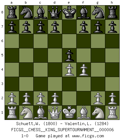 Last move : 1-0 2019 October 2 12:52:30 [Event "FICGS__CHESS__KING_SUPERTOURNAMENT__000006"] [Site "FICGS"] [Date "2019.09.02"] [Round "1"] [White "Schuett,Wilhelm"] [Black "Valentin,Laurentiu"] [Result "1-0"] [WhiteElo "1800"] [BlackElo "1284"] 1.e4 e5 2.f4 1-0 This chess game has been lost on time (started : 2019.09.02 1:48:4) King's gambit Player White won this chess game. Follow this game move after move (download)First-class players lose to second-class players because second-class players sometimes play a first-class game. (Siegbert Tarrasch) Der Traum, für den ich lebe, ist der von einem freien Russland. Viele mögen sagen: Russland hat doch ein Parlament, einen gewählten Präsidenten. Aber ich spüre, dass in meiner Heimat die Angst wiederkehrt. Eine Angst, sich frei zu äußern, bestimmte Dinge zu tun (Garry Kasparov) El Ajedrez es como la guerra en un tablero. (Bobby Fischer) Les erreurs sont comme les malheurs, elles n'arrivent jamais seules. (Siegbert Tarrasch) Computers are like Old Testament gods; lots of rules and no mercy. (Joseph Campbell)