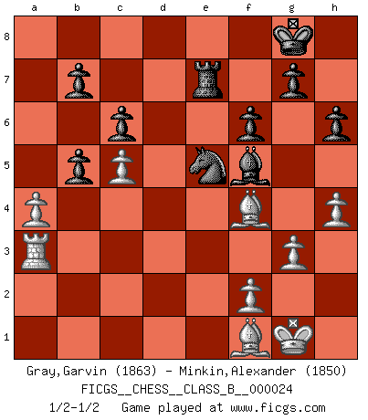 Last move : 1/2-1/2 2007 October 12 15:6:31 [Event "FICGS__CHESS__CLASS_B__000024"] [Site "FICGS"] [Date "2007.06.23"] [Round "1"] [White "Gray,Garvin"] [Black "Minkin,Alexander"] [Result "1/2-1/2"] [WhiteElo "1863"] [BlackElo "1850"] 1.c4 Nf6 2.Nc3 e6 3.d4 Bb4 4.g3 O-O 5.Bg2 d5 6.cxd5 exd5 7.Nf3 c6 8.O-O Nbd7 9.a3 Bd6 10.Nd2 Be7 11.Re1 Nb6 12.e4 dxe4 13.Ndxe4 Nxe4 14.Nxe4 Bf5 15.Nc5 Bxc5 16.dxc5 Qxd1 17.Rxd1 Nc4 18.b4 Rad8 19.Re1 Rfe8 20.Rxe8+ Rxe8 21.Bf4 h6 22.h4 a6 23.a4 Re7 24.Bf1 Ne5 25.Ra3 f6 26.b5 axb5 1/2-1/2 English Opening Kingside Castling by player Black (move 4) Kingside Castling by player White (move 8) This chess game ended in a draw. Follow this game move after move (download)I have never in my life played the French Defence, which is the dullest of all openings. (Wilhelm Steinitz) Vom Schach wurde gesagt das Leben sei dafür nicht lange genug. Aber das ist der Fehler des Lebens, nicht des Schach'. (Irving Chernev) Los Peones son nacidos libres, y aún así, se encuentran encadenados por todos lados. (Rick Kennedy) A chaque perte on perd un peu de soi. (Joël Lautier) Methinks King Thibault should dub Marius Zubac a knight of the square board... I mean table, henceforth addressing him as Sir Marius, and bestow on him a suitable land from the kingdom of FICGS & marry him off to a worthy, fair maiden, lest he slice our heads with his mighty sword in his wrath. (Dinesh De Silva)