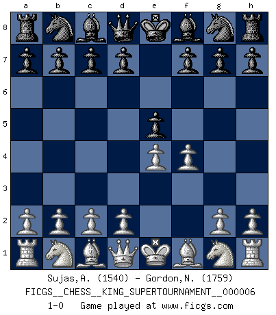 Last move : 1-0 2019 October 2 12:52:30 [Event "FICGS__CHESS__KING_SUPERTOURNAMENT__000006"] [Site "FICGS"] [Date "2019.09.02"] [Round "1"] [White "Sujas,Abdulsamad"] [Black "Gordon,Nicholas"] [Result "1-0"] [WhiteElo "1540"] [BlackElo "1759"] 1.e4 e5 2.f4 1-0 This chess game has been lost on time (started : 2019.09.02 1:48:4) King's gambit Player White won this chess game. Follow this game move after move (download)Chess is as much a mystery as women. (Purdy) Modernes Schach erfordert enorme Anspannung. Es ist für einen normalen Menschen unmöglich das auszuhalten. (Viktor Kortschnoi) La táctica fluye a partir de una posición superior. (Bobby Fischer) Toute estimation doit être constamment réévaluée. (Jacob Estrin) The modern world has divided itself into Conservatives and Progressives. The business of Progressives is to go on making mistakes. The business of the Conservatives is to prevent the mistakes from being corrected. (G.K. Chesterton)