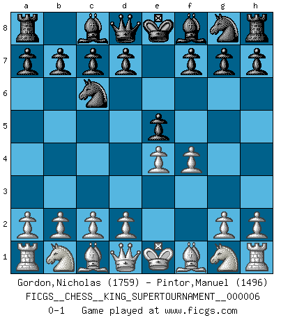 Last move : 0-1 2019 October 2 12:52:30 [Event "FICGS__CHESS__KING_SUPERTOURNAMENT__000006"] [Site "FICGS"] [Date "2019.09.02"] [Round "1"] [White "Gordon,Nicholas"] [Black "Pintor,Manuel"] [Result "0-1"] [WhiteElo "1759"] [BlackElo "1496"] 1.e4 e5 2.f4 Nc6 0-1 This chess game has been lost on time (started : 2019.09.02 1:48:4) King's gambit Player Black won this chess game. Follow this game move after move (download)Life is a kind of Chess, with struggle, competition, good and ill events. (Benjamin Franklin) Strategie ist, wie man ein Mädchen auf den Rücksitz bekommt. Taktik ist, was man tut, wenn man dann dort ist. (Anonymous) Vive, pierde y aprende al observar a tu oponente como gana. (Amber Steenbock) Ce n'est pas pour s'amuser qu'il joue aux échecs : il célèbre un culte. (Vladimir Nabokov) The smarter you play, the luckier you'll be. (Mark Pilarski)