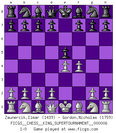Last move : 1-0 2019 October 2 12:52:30 [Event "FICGS__CHESS__KING_SUPERTOURNAMENT__000006"] [Site "FICGS"] [Date "2019.09.02"] [Round "1"] [White "Zaunercik,Ilmar"] [Black "Gordon,Nicholas"] [Result "1-0"] [WhiteElo "1439"] [BlackElo "1759"] 1.e4 e5 2.f4 1-0 This chess game has been lost on time (started : 2019.09.02 1:48:4) King's gambit Player White won this chess game. Follow this game move after move (download)No other master has such a terrific will to win. At the board he radiates danger, and even the strongest opponents tend to freeze, like rabbits when they smell a panther. Even his weaknesses are dangerous. As white, his opening game is predictable - you can make plans against it - but so strong that your plans almost never work. In the middle game his precision and invention are fabulous, and in the end game you simply cannot beat him. (Anonymous German Expert) Frage des Reporters: -Welche besonderen Umstände rechtfertigen das Anhalten der Uhren während einer Turnierpartie? Antwort: -Einen Fotographen zu strangulieren. (Siegbert Tarrasch) La captura del Rey enemigo es la finalidad pero no el primer objetivo de la partida. (William Steinitz) Votre prénom est 'Tactique', votre deuxième prénom est 'Tactique' et votre nom est 'Tactique'. (Ken Smith) All art requires courage. (Anne Tucker)