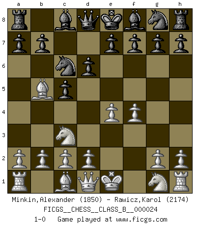 Last move : 1-0 2007 August 3 13:56:22 [Event "FICGS__CHESS__CLASS_B__000024"] [Site "FICGS"] [Date "2007.06.23"] [Round "1"] [White "Minkin,Alexander"] [Black "Rawicz,Karol"] [Result "1-0"] [WhiteElo "1850"] [BlackElo "2174"] 1.e4 c5 2.Nc3 d6 3.f4 Nc6 4.Bb5 1-0 This chess game has been lost on time (started : 2007.06.23 2:55:6) Sicilian : Closed Player White won this chess game. Follow this game move after move (download)First-class players lose to second-class players because second-class players sometimes play a first-class game. (Siegbert Tarrasch) Schach sollte überall auf der Welt Schulfach werden. Es fördert die geistige Auseinandersetzung. Es lehrt die Demut in der Niederlage. (Garry Kasparov) No puedes jugar al Ajedrez si eres de corazón noble. (Proverbio Francés) Je ne suis pas le dernier à jouer lâchement des coups douteux pendant le zeïtnot de l'adversaire pour l'achever: en effet les coups qui font le plus peur sont ceux que l'on ne comprend pas. Je me fais souvent peur quand je joue. (Un professeur anonyme) It is not enough to be a good player... you must also play well. (Siegbert Tarrasch)