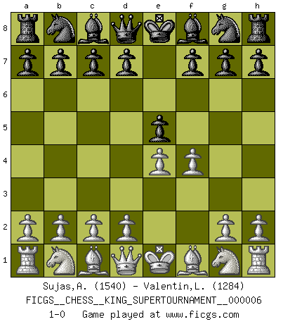 Last move : 1-0 2019 October 2 12:52:30 [Event "FICGS__CHESS__KING_SUPERTOURNAMENT__000006"] [Site "FICGS"] [Date "2019.09.02"] [Round "1"] [White "Sujas,Abdulsamad"] [Black "Valentin,Laurentiu"] [Result "1-0"] [WhiteElo "1540"] [BlackElo "1284"] 1.e4 e5 2.f4 1-0 This chess game has been lost on time (started : 2019.09.02 1:48:4) King's gambit Player White won this chess game. Follow this game move after move (download)During a Chess competition a Chessmaster should be a combination of a beast of prey and a monk. (Alexander Alekhine) Offensichtlich kennt Kasparow nichts anderes als Schach, und ich könnte 500 weitere Spieler dieser Sorte benennen. (Judith Polgar) El juego de Fischer siempre fue nítido, racional y brillante. Uno de los mejores por siempre. (Dave Regis) Le profane ne songe pas à la somme de jouissance dont il se prive, qui méconnaît ce jeu aux ressources aussi variées que passionnantes. (Jean-Marie Jeanton-Lamarche) He who defends everything defends nothing. (Frederick the Great)