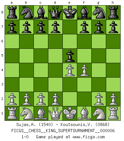 Last move : 1-0 2019 October 2 12:52:30 [Event "FICGS__CHESS__KING_SUPERTOURNAMENT__000006"] [Site "FICGS"] [Date "2019.09.02"] [Round "1"] [White "Sujas,Abdulsamad"] [Black "Koutsounis,Vassilios"] [Result "1-0"] [WhiteElo "1540"] [BlackElo "0868"] 1.e4 e5 2.f4 1-0 This chess game has been lost on time (started : 2019.09.02 1:48:4) King's gambit Player White won this chess game. Follow this game move after move (download)I have always a slight feeling of pity for the man who has no knowledge of Chess. (Siegbert Tarrasch) Dass jemand wie Surab Asmaiparaschwili, der selbst Elopunkte gekauft hat , Vize-Präsident der Fide werden konnte, sagt schon einges über den Zustand dieser Organisation aus. (Joel Lautier) Una de estas pequeñas movidas modestas pudieran ser mas molestas a tu oponente que la amenaza mas grande. (Siegbert Tarrasch) L'ordinateur a tué l'originalité. Il n'y a plus guère d'aventures sur l'échiquier. (Jacob Murray) Perhaps the current trend of many chess professionals taking up the more lucrative pastime of poker is not a wholly negative one. It may not be too late for humans to relearn how to take risks in order to innovate and thereby maintain the advanced lifestyles we enjoy. And if it takes a poker-playing supercomputer to remind us that we can't enjoy the rewards without taking the risks, so be it. (The Chess Master and the Computer, by Garry Kasparov - 2010)