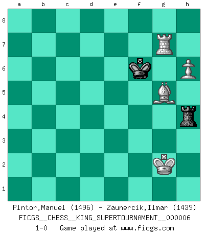 Last move : 1-0 2019 October 4 12:49:56 [Event "FICGS__CHESS__KING_SUPERTOURNAMENT__000006"] [Site "FICGS"] [Date "2019.09.02"] [Round "1"] [White "Pintor,Manuel"] [Black "Zaunercik,Ilmar"] [Result "1-0"] [WhiteElo "1496"] [BlackElo "1439"] 1.e4 e5 2.f4 exf4 3.Nf3 Nc6 4.Bc4 Bc5 5.d4 Bb6 6.Bxf4 d6 7.O-O Bg4 8.Bxf7+ Kf8 9.Bxg8 Rxg8 10.c3 Qe7 11.h3 Bxf3 12.Qxf3 Ke8 13.Qh5+ Kd7 14.Bg5 Qe6 15.Qxh7 Nxd4 16.cxd4 Bxd4+ 17.Kh1 Bxb2 18.Nd2 Bxa1 19.Rxa1 Qe5 20.Qf5+ Qxf5 21.exf5 Rae8 22.g4 Re2 23.a4 c5 24.Rb1 b6 25.a5 Kc6 26.axb6 axb6 27.Nc4 b5 28.Na3 b4 29.Nc4 d5 30.Nd2 Ra8 31.h4 Ra2 32.Nf3 b3 33.Rxb3 Ra1+ 34.Ng1 c4 35.Rg3 d4 36.f6 gxf6 37.Bxf6 Kd5 38.g5 c3 39.g6 c2 40.Bg5 Kc4 41.g7 Re8 42.h5 Ra5 43.Ne2 Ra1+ 44.Bc1 d3 45.g8Q+ Rxg8 46.Rxg8 d2 47.Rc8+ Kd3 48.Rd8+ Kxe2 49.Rxd2+ Kf3 50.Rxc2 Kg4 51.h6 Ra7 52.Rg2+ Kf5 53.Rg7 Ra1 54.Rc7 Ra4 55.Kg2 Rh4 56.Rg7 Kf6 57.Bg5+ 1-0 King's knight's gambit Kingside Castling by player White (move 7) Promotion Queen by player White (move 45) 10 pieces endgame at move 45 : White KRBNP , Black KRRPP WHITE : King + 1 Rook 1 Bishop 1 Knight 1 Pawn BLACK : King + 2 Rooks 2 Pawns 9 pieces endgame at move 46 : White KRBNP , Black KRPP WHITE : King + 1 Rook 1 Bishop 1 Knight 1 Pawn BLACK : King + 1 Rook 2 Pawns 8 pieces endgame at move 48 : White KRBP , Black KRPP WHITE : King + 1 Rook 1 Bishop 1 Pawn BLACK : King + 1 Rook 2 Pawns 7 pieces endgame at move 49 : White KRBP , Black KRP WHITE : King + 1 Rook 1 Bishop 1 Pawn BLACK : King + 1 Rook 1 Pawn 6 pieces endgame at move 50 : White KRBP , Black KR WHITE : King + 1 Rook 1 Bishop 1 Pawn BLACK : King + 1 Rook Player White won this chess game. Follow this game move after move (download)Tactics flow from a superior position. (Bobby Fischer) Modernes Schach sorgt sich zuviel um Dinge wie Bauernstruktur usw. Vergessen Sie das, Schachmatt beendet das Spiel! (Nigel Short) La captura del Rey enemigo es la finalidad pero no el primer objetivo de la partida. (William Steinitz) Dans le domaine de la peinture, de la gravure et de la sculpture, dès la première décennie de notre siècle, les artistes abandonnent la représentation de la partie d'échecs pour se concentrer sur les pièces, sur les échiquiers et sur toutes les variations auxquelles les unes et les autres peuvent donner lieu. On passe en quelque sorte d'un thème social à un thème musical (au sens de la musica médiévale, c'est-à-dire d'une notion qui inclue le rythme, l'harmonie, la construction et la déconstruction, etc.). Graphiquement et picturalement, l'échiquier apparaît comme une structure ouverte, dynamique, d'une richesse infinie, autorisant toutes les combinatoires et débouchant sur des mouvements et des rythmes de nature exponentielle. (Michel Pastoureau) Macintosh - we might not get everything right, but at least we knew the century was going to end. (Douglas Adams)