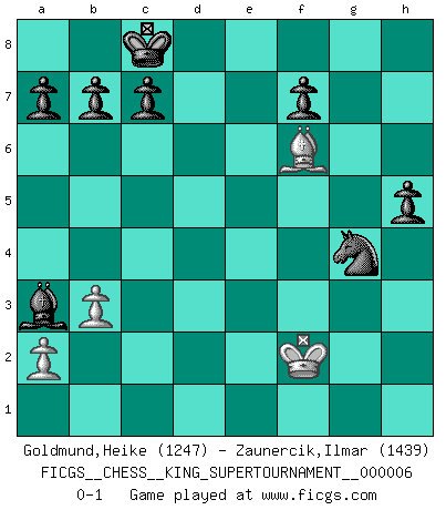 Last move : 0-1 2019 October 6 20:22:21 [Event "FICGS__CHESS__KING_SUPERTOURNAMENT__000006"] [Site "FICGS"] [Date "2019.09.02"] [Round "1"] [White "Goldmund,Heike"] [Black "Zaunercik,Ilmar"] [Result "0-1"] [WhiteElo "1247"] [BlackElo "1439"] 1.e4 e5 2.f4 exf4 3.d4 d5 4.e5 Nc6 5.Nf3 g5 6.Bb5 g4 7.Nfd2 Qh4+ 8.Kf1 Bd7 9.Nc3 Nge7 10.Qe1 Qxe1+ 11.Kxe1 Nxd4 12.Bxd7+ Kxd7 13.Kd1 Ng6 14.Nxd5 Rd8 15.Nf6+ Kc8 16.b3 f3 17.gxf3 Nxf3 18.Ke2 Ngxe5 19.Nxg4 Nd4+ 20.Kd1 Nxg4 21.Rg1 Nxh2 22.Bb2 Ndf3 23.Rg2 Bh6 24.Bxh8 Nxd2 25.Rxh2 Nf3 26.Ke2 Nxh2 27.Bf6 Rd2+ 28.Ke1 Rxc2 29.Rd1 Rc1 30.Rxc1 Bxc1 31.Kd1 Ba3 32.Ke2 h5 33.Kf2 Ng4+ 0-1 KGA : Villemson (Steinitz) gambit Player Black won this chess game. Follow this game move after move (download)Of Chess it has been said that life is not long enough for it, but that is the fault of life, not Chess. (William Ewart Napier) Ich verachte die Medien. (Robert James Fischer) En manos de Fischer's, una diminuta ventaja teórica es tan buena como tener una Reina de ventaja. (Isaac Kashdan) Le succès, c'est être capable d'aller d'échec en échec sans perdre son enthousiasme. (Winston Churchill) Don't be discouraged. It's often the last key in the bunch that opens the lock. (Author unknown)
