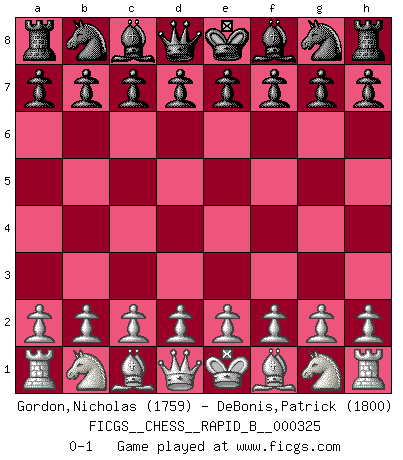 Last move : 0-1 2019 October 4 2:10:26 [Event "FICGS__CHESS__RAPID_B__000325"] [Site "FICGS"] [Date "2019.09.03"] [Round "1"] [White "Gordon,Nicholas"] [Black "DeBonis,Patrick"] [Result "0-1"] [WhiteElo "1759"] [BlackElo "1800"] 0-1 This chess game has been lost on time (started : 2019.09.03 22:45:4) Player Black won this chess game. Follow this game move after move (download)Bobby Fischer's current state of mind is indeed a tragedy. One of the world's greatest Chess players - the pride and sorrow of American Chess. (Frank Brady) Im Hotelzimmer gab es nur zwei Schaben. (Über die Turnierbedingungen) (Peter Swidler) Vive, pierde y aprende al observar a tu oponente como gana. (Amber Steenbock) RxDa4 pat (...) If we don't succeed, we run the risk of failure. (George W. Bush)