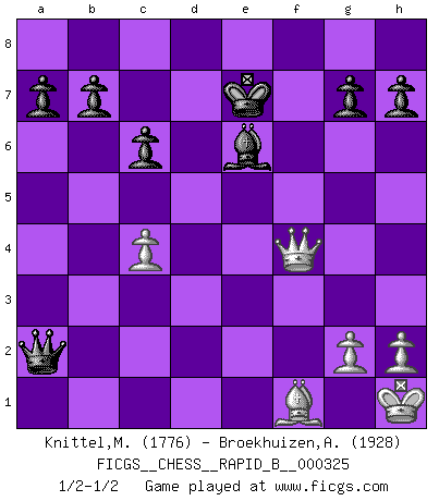 Last move : 1/2-1/2 2020 February 6 9:53:8 [Event "FICGS__CHESS__RAPID_B__000325"] [Site "FICGS"] [Date "2019.09.03"] [Round "1"] [White "Knittel,Martin"] [Black "Broekhuizen,A. T. S."] [Result "1/2-1/2"] [WhiteElo "1776"] [BlackElo "1928"] 1.e4 e5 2.Nf3 Nc6 3.Bb5 Nf6 4.O-O Nxe4 5.Re1 Nd6 6.Nxe5 Be7 7.Bf1 Nxe5 8.Rxe5 O-O 9.d4 Bf6 10.Re1 Re8 11.Bf4 Ne4 12.Nd2 d5 13.Nxe4 dxe4 14.c3 Bg5 15.Be5 f6 16.Bg3 f5 17.Be5 Be6 18.f3 Bd5 19.fxe4 fxe4 20.Qg4 Bf6 21.Rad1 Bxe5 22.dxe5 c6 23.c4 Qb6+ 24.Kh1 Bf7 25.Qxe4 Qxb2 26.Rd7 Bg6 27.Qe3 Bf5 28.Rd6 Qxa2 29.e6 Re7 30.Qg5 Rxe6 31.Rd8+ Rxd8 32.Qxd8+ Kf7 33.Qd7+ Kf6 34.Rxe6+ Bxe6 35.Qd8+ Kf7 36.Qc7+ Kf6 37.Qf4+ Ke7 38.Qg5+ Kf7 39.Qf4+ Ke7 40.Qg5+ Kf7 41.Qf4+ Ke7 1/2-1/2 Ruy Lopez : Berlin defense, Open variation Kingside Castling by player White (move 4) Kingside Castling by player Black (move 8) This chess game ended in a draw. Follow this game move after move (download)It is no time to be playing Chess when the house is on fire. (Italian Proverb) Ein Großmeister muß tausende Partien in seinem Kopf speichern, denn diese sind für Ihn, was die Worte der Muttersprache für gewöhnliche Leute sind, oder Noten für Musiker... (Garry Kasparov) Si el Ajedrez es una ciencia, es la mas inexacta. Si el Ajedrez es un arte, es demasiado inexacto para ser visto como tal. Si el Ajedrez es un deporte, es demasiado esotérico. Si el Ajedrez es un juego, es demasiado exigente para ser solo un juego. Si el Ajedrez es una aventura, es una muy demandante. Si el Ajedrez es una pasión, es una muy gratificante. Si el Ajedrez es la vida, es una muy triste. (Anónimo) Les Echecs représentent une sphère d'idées créatrices basée sur la volonté des deux protagonistes. (Smyslov) Hold em is to stud what chess is to checkers. (Johnny Moss)