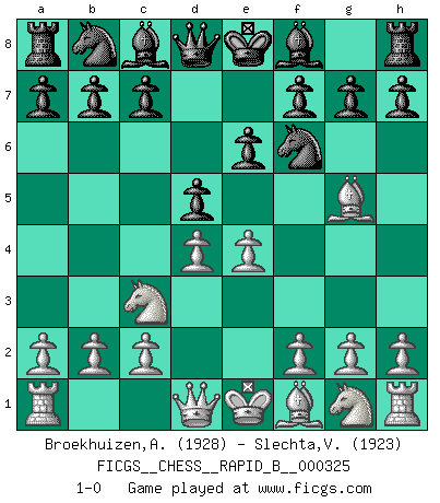 Last move : 1-0 2019 October 11 15:56:56 [Event "FICGS__CHESS__RAPID_B__000325"] [Site "FICGS"] [Date "2019.09.03"] [Round "1"] [White "Broekhuizen,A. T. S."] [Black "Slechta,Vladimir"] [Result "1-0"] [WhiteElo "1928"] [BlackElo "1923"] 1.e4 e6 2.d4 d5 3.Nc3 Nf6 4.Bg5 1-0 This chess game has been lost on time (started : 2019.09.03 22:45:4) French defense Player White won this chess game. Follow this game move after move (download)Nowadays, when you're not a grandmaster at 14, you can forget about it. (Anand Viswanathan) Das Schach ist nichts für kleine Geister, es beansprucht einen vollen Mann, der sich nicht sklavisch an das Überlieferte hält, sondern selbständig die Tiefen des Spiels zu ergründen sucht. (Wilhelm Steinitz) La batalla por la última verdad nunca sera ganada. Y es por eso que el Ajedrez es tan fascinante. (Hans Kmoch) Lorsque vous vous retrouvez devant une position atroce, ne tendez pas un ultime piège dérisoire avec l'intention d'abandonner si l'adversaire le déjoue ! Faites-vous plutôt un devoir de résister comme si votre vie en dépendait. Jouez le coup qui vous déplairait au centuple si vous étiez dans la peau de votre tortionnaire ! Luck never made a man wise. (Seneca, Letters to Lucilius)