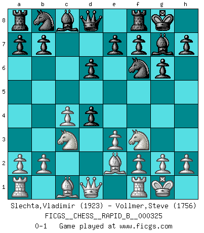 Last move : 0-1 2019 October 11 15:56:56 [Event "FICGS__CHESS__RAPID_B__000325"] [Site "FICGS"] [Date "2019.09.03"] [Round "1"] [White "Slechta,Vladimir"] [Black "Vollmer,Steve"] [Result "0-1"] [WhiteElo "1923"] [BlackElo "1756"] 1.d4 Nf6 2.c4 g6 3.Nc3 d6 4.e3 Bg7 5.Nf3 O-O 6.Be2 c5 7.O-O cxd4 0-1 This chess game has been lost on time (started : 2019.09.03 22:45:4) King's Indian defense, 3.Nc3 Kingside Castling by player Black (move 5) Kingside Castling by player White (move 7) Player Black won this chess game. Follow this game move after move (download)There are tough players and nice guys, and I'm a tough player. (Bobby Fischer) Habe Mut, dich deines eigenen Verstandes zu bedienen. (Immanuel Kant) Antes de los Finales, los dioses han colocado el Juego Medio. (Siegbert Tarrasch) On entre au jeu d'Echecs comme on entre en Religion. Pour le joueur d'Echecs, la partie d'Echecs c'est l'office, la messe, le défilé du 1er Mai, le dépôt de gerbe au Monument aux Morts. C'est un drame sacré. (Michel Roos) After growing wildly for years, the field of computing appears to be reaching its infancy. (John Pierce)