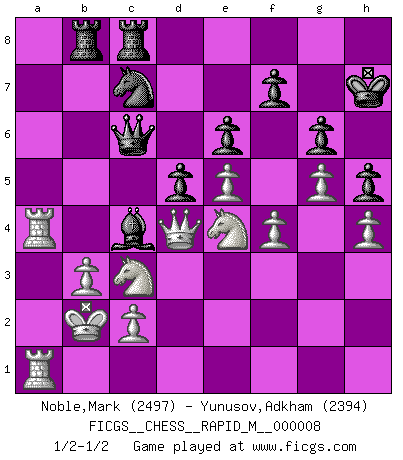 Last move : 1/2-1/2 2007 October 4 9:52:56 [Event "FICGS__CHESS__RAPID_M__000008"] [Site "FICGS"] [Date "2007.06.23"] [Round "1"] [White "Noble,Mark"] [Black "Yunusov,Adkham"] [Result "1/2-1/2"] [WhiteElo "2497"] [BlackElo "2394"] 1.e4 c5 2.Nf3 d6 3.d4 cxd4 4.Nxd4 Nf6 5.Nc3 g6 6.Be3 Bg7 7.f3 O-O 8.Qd2 Nc6 9.Bc4 Bd7 10.O-O-O Rc8 11.Bb3 Ne5 12.Kb1 Nc4 13.Bxc4 Rxc4 14.g4 a6 15.h4 h5 16.g5 Ne8 17.b3 Rc8 18.Nde2 e6 19.Bd4 Bxd4 20.Qxd4 Qc7 21.f4 b5 22.Rhf1 a5 23.a3 Bc6 24.Ng3 b4 25.axb4 axb4 26.Qxb4 d5 27.e5 Bb5 28.Rf3 Ba6 29.Kb2 Qc6 30.Rf2 Ng7 31.Ra1 Rc7 32.Ra5 Rfc8 33.Na4 Rb7 34.Qc5 Qe8 35.Qe3 Bb5 36.Nc3 Bc4 37.Ra7 R7b8 38.Rd2 Qc6 39.Rd1 Ne8 40.Ra5 Rb4 41.Ra4 R4b8 42.Rda1 Kh7 43.Qd4 Nc7 44.Nge4 1/2-1/2 Sicilian : Dragon, Yugoslav attack, 7...O-O Kingside Castling by player Black (move 7) Queenside Castling by player White (move 10) This chess game ended in a draw. Follow this game move after move (download)It is peculiar but a fact nevertheless, that gamblers in chess always have enthusiastic followers. (Botvinnik) Ich habe kein Problem mit Frauen, sondern nur mit dem Niveau ihres Schachspiels (Judith Polgar) Fischer deseaba darle a los Rusos una sopa de su propia medicina. (Larry Evans) Mon pion favori sur ma case favorite ! Bronstein en parlant d'un coup de pion en h5 quand il avait les Noirs. A journey of a thousand sites begins with a single click. (Author unknown)
