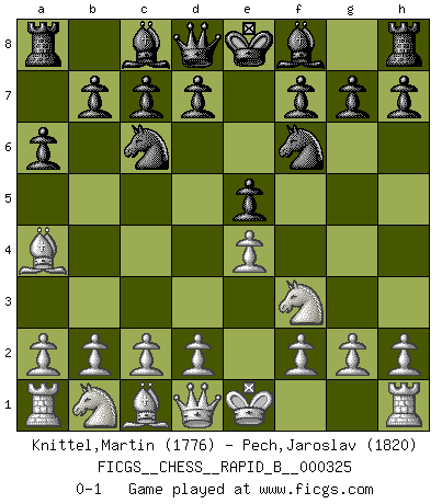 Last move : 0-1 2019 October 31 23:52:16 [Event "FICGS__CHESS__RAPID_B__000325"] [Site "FICGS"] [Date "2019.09.03"] [Round "1"] [White "Knittel,Martin"] [Black "Pech,Jaroslav"] [Result "0-1"] [WhiteElo "1776"] [BlackElo "1820"] 1.e4 e5 2.Nf3 Nc6 3.Bb5 a6 4.Ba4 Nf6 0-1 This chess game has been lost on time (started : 2019.09.03 22:45:4) Ruy Lopez : Morphy defense Player Black won this chess game. Follow this game move after move (download)The passed pawn is a criminal, who should be kept under lock and key. Mild measures, such as police surveillance, are not sufficient. (Nimzovitch) Smyslow ist ein Beweis dafür, dass ich noch zehn Jahre spielen kann! [der 75 jährige über den 85 jährigen] (Viktor Kortschnoi) Un Peón pasado es un criminal, quién debe ser mantenido bajo candado y llave. Leves medidas, tales como vigilancia policiaca, no son suficientes. (Aaron Nimzovich) Fischer est le meilleur joueur du monde et Karpov n'est qu'un joueur de bistrot. (Garry Kasparov, agé de 16 ans) In my experience, there's no such thing as luck. (Obi-Wan Kenobi in Star Wars ep.4)